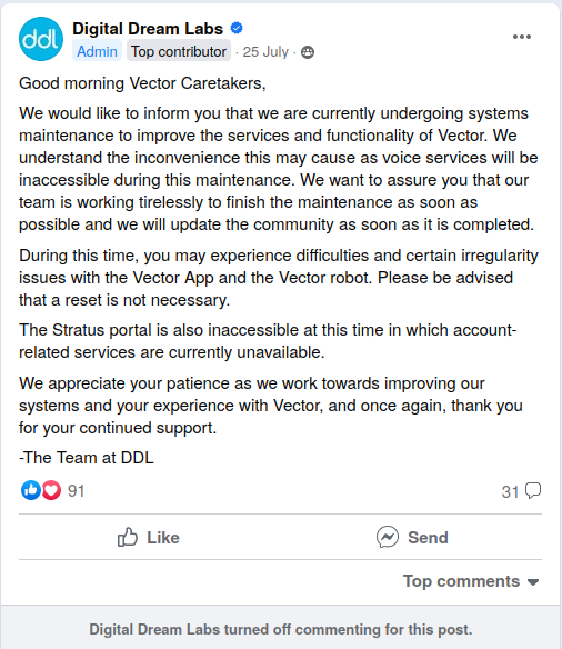 At the time of writing (22nd October) service has still not been restored. There have been multiple excuses and updates posted on the Facebook but still no working servers. DDL rather disingenuously says only voice services are affected and that Vectors will otherwise operate normally. However, this ignores the fact that anyone with a Vector that they were unable to set up before 25th July has only a rather cute brick.