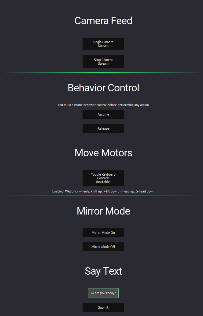 For starters you can see vectors camera feed - this is very laggy and only manages a couple of frames per second (if that) on my system. You can also take control of Vector’s motors and drive it around as well as entering some text for Vector to speak.