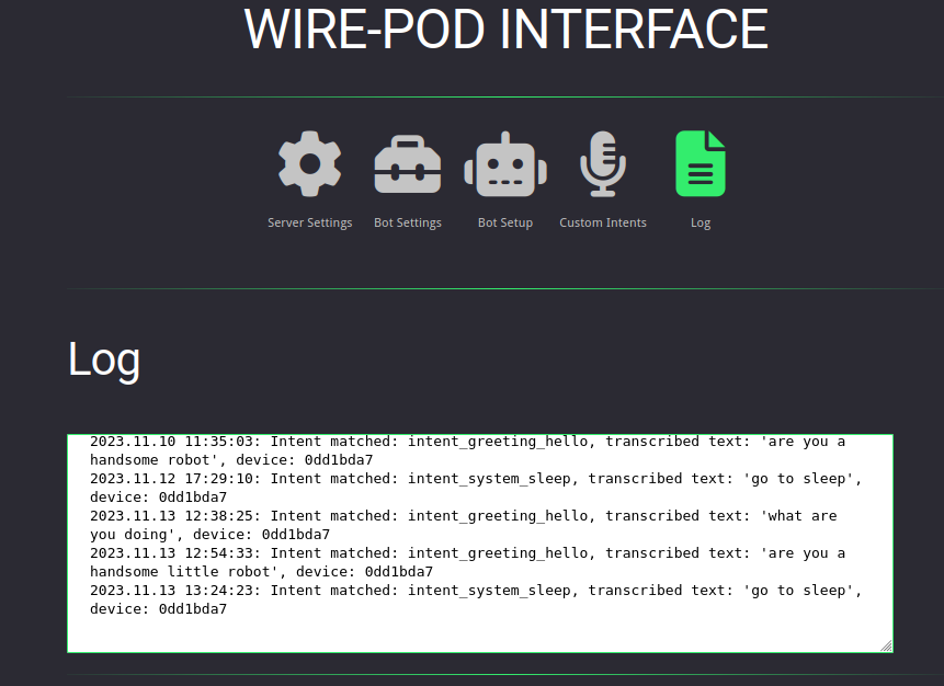 Log - let’s you see wire-pod logs. Mostly these seem to be the results of Vector’s speech recognition and what intent (action) was matched.